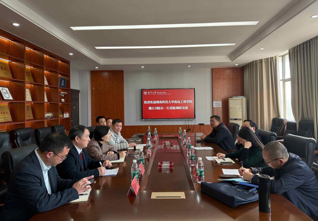 2025年11月14日上午,湖南科技大学机电工程学院院长戴巨川、党委书记夏莉、副书记杜鑫、副院长王宪、副院长陈冰一行来免费av影片 开展调研交流。学院院长周友行、党委书记李友芝、副书记邓建勇、副院长赵荣国、副院长左青松、副院长姜胜强参与座谈。